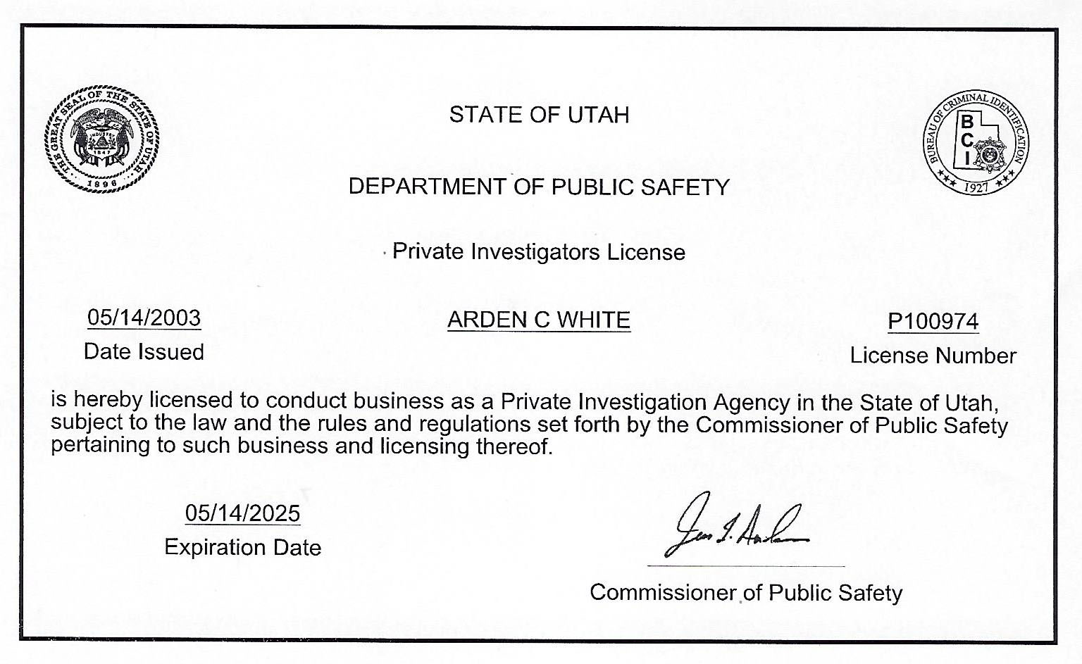 Arden C. White Investigations was incorporated under the laws of Utah in 2013 as Business Entity #5847948-0160. We were previously established as Arden C. White and Associates in 1994. Our corporation is in good standing.